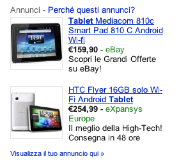 . Gli annunci con scheda di prodotto sono un formato di annunci che facilita la promozione dell'intera gamma dei vostri prodotti offrendo al tempo stesso a potenziali clienti risultati pertinenti di alta qualità. Fin dall'introduzione lo scorso anno in Francia, Germania e Regno Unito, gli inserzionisti europei hanno inserito nelle proprie schede di prodotto centinaia di milioni di prodotti. Abbiamo registrato, inoltre, che gli utenti hanno il doppio di probabilità di fare clic su un annuncio con scheda di prodotto rispetto a quelle di fare clic su un annuncio di testo standard nella stessa località.