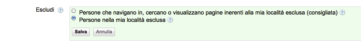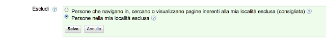Va ricordato che in tutte le campagne con targeting sulla Rete Display verrà automaticamente attivata l'opzione predefinita, la quale include sia gli utenti che si trovano nella località target sia gli utenti che eseguono ricerche o stanno visualizzando pagine relative a essa. Ciò potrebbe comportare un leggero aumento nel traffico delle campagne quando gli utenti visualizzano pagine relative alla vostra località target. Se preferite escludere questo traffico, potete selezionare "Persone nella mia località target" nelle opzioni di posizione avanzate.