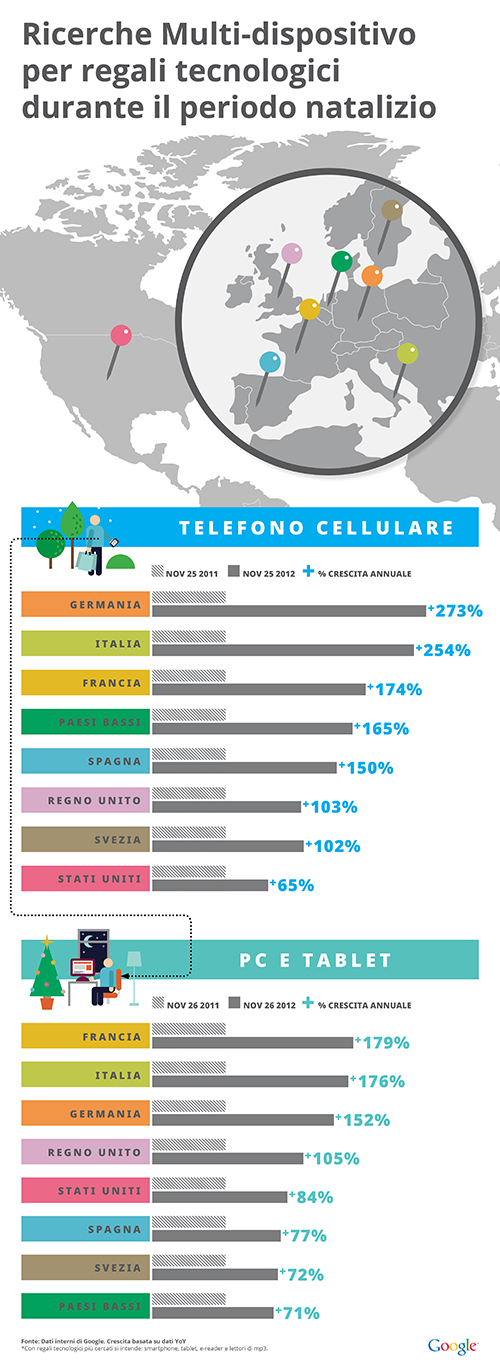 Guardando alle ricerche di regali per le feste comunemente utilizzate negli Stati Uniti ed in Europa e abbiamo scoperto che domenica 25 novembre c'è stata un'impennata delle ricerche da cellulare e smartphone. In quella giornata, in Italia, ad esempio, le ricerche relative ad apparecchi elettronici inviate dai cellulari sono aumentate addirittura